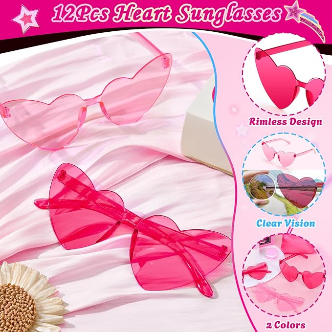 - Stand Out with Pink Sunglasses - Among such a rich variety of pink party favors, pink glasses are the most eye-catching. As a fashion accessory and daily wear all year round, the heart glasses lens length is approximately 5.59 inches, height is 1.97 inches, frame legs are 5.67 inches long, and are sized to fit most people. The frameless design and lightweight nose bridge structure make it comfortable for everyone to wear. Wear these pink glasses and become the most fashionable on