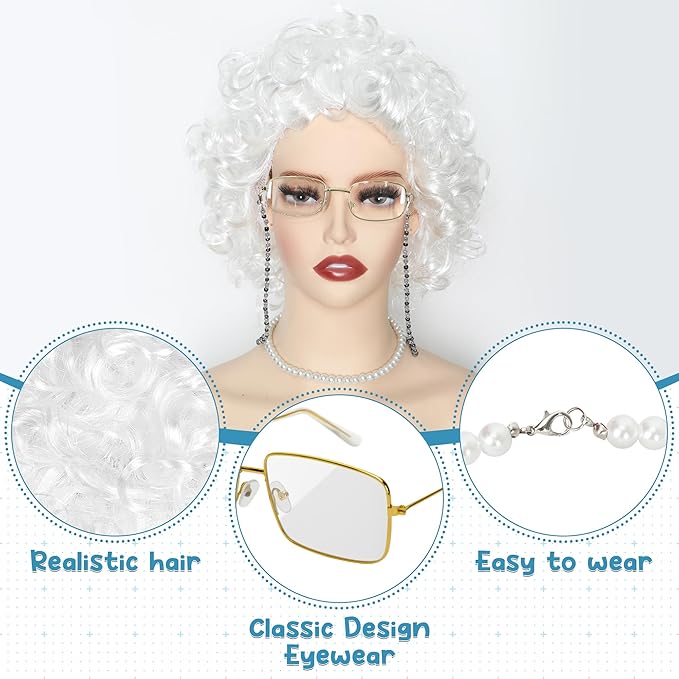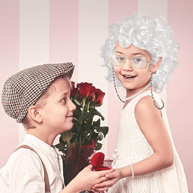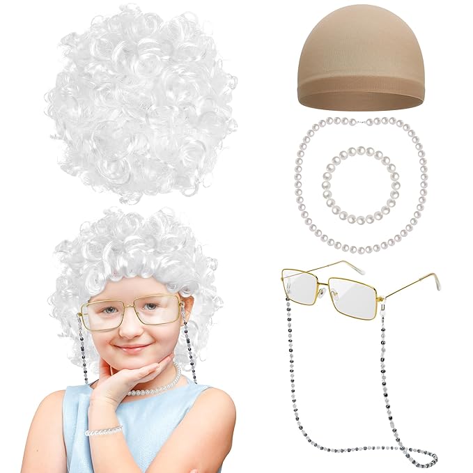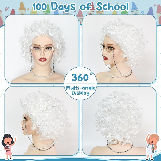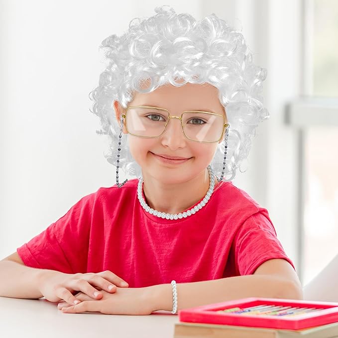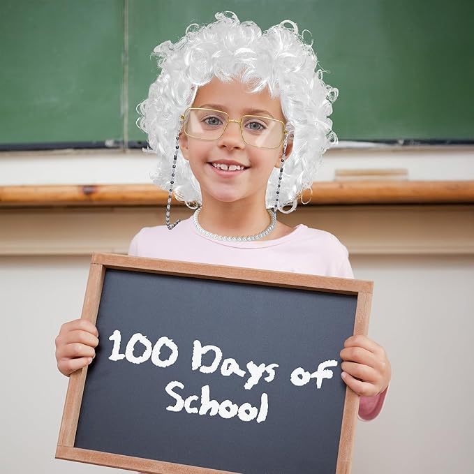 - Cherished Grandma Look: Celebrate the 100th day of school with our 100 day of school costume for girls, featuring a whiter curly wig, granny glasses with a chain, pearl necklace, pearl bracelet, and wig cap for an adorable grandma costume transformation.