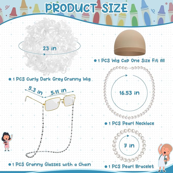 - Comfortably Fits All Youngsters: Huskein old lady wig measures 13.4 inches, with accessories including a 16.53-inch pearl necklace, 7-inch pearl bracelet, 5.11-inch granny glasses, and a 25.7-inch glasses chain, ensuring a snug fit for children of all sizes.
