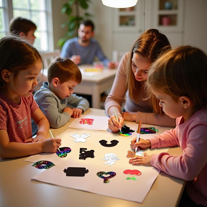 - 【100 Pack Valentines Scratch Paper Art】Package include 100 PCS Valentines scratch papers, 50 PCS wooden styluses and 100 PCS cords. Easy to get a magic and colorful Valentines craft even a little kid. It's a fun Valentines school or classroom activity for kids to use their imagination.