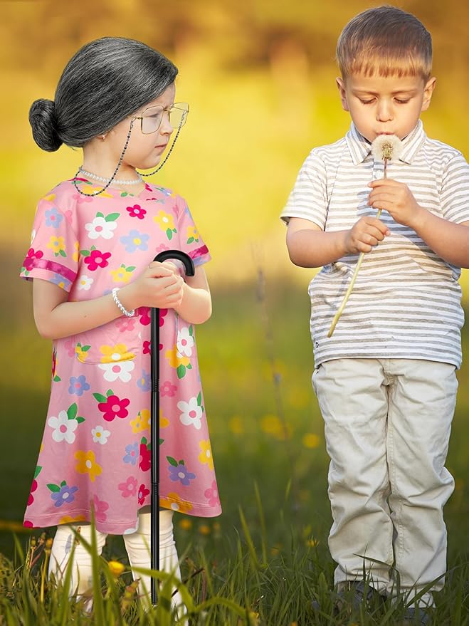 - Everything You Need: Huskein comprehensive costume set includes a grandma dress, black white bun wig, granny glasses with a chain, pearl necklace, pearl bracelet, wig cap, and kids cane. Perfect for creating the perfect old lady costume for kids.