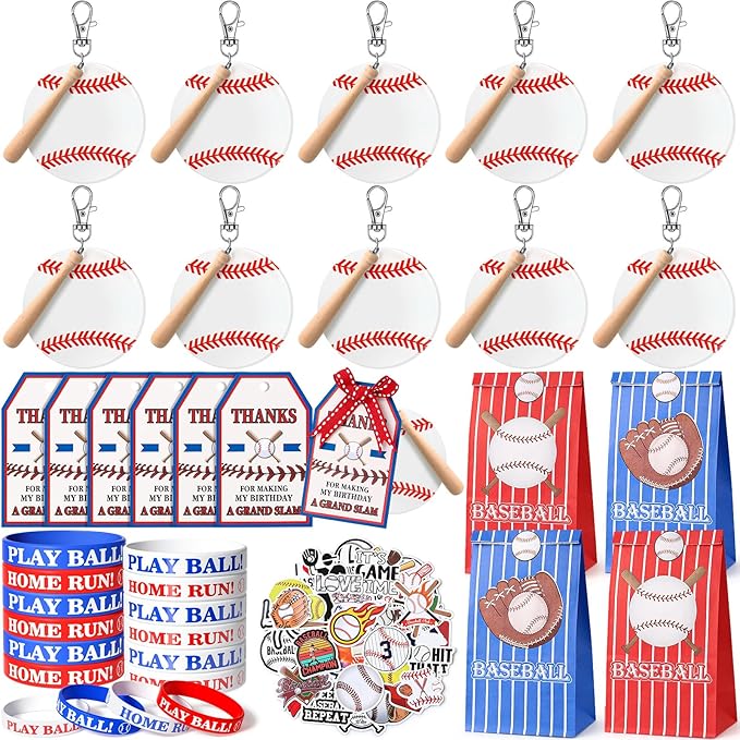 - Baseball Birthday Party Favors: This is a set of party favors specially prepared for baseball fans. It includes 12 large acrylic keychains, 12 paper bags, 12 silicone bracelets, 12 thank you cards, 50 baseball stickers, and 1 roll of ribbon. Rich and fun accessories can help you host a baseball theme party and entertain 12 children