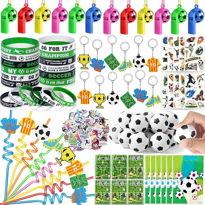 - Go Soccer Party: We've prepared 9 different funny soccer gifts for soccer fans. Kids can drink from straws, give each other gifts in bags, decompress with bouncy balls, use whistles to join games, and have fun with puzzle toys. Accessories like bracelets, keychains, and stickers can be used as everyday accessories. It's the perfect addition to soccer birthday party decorations