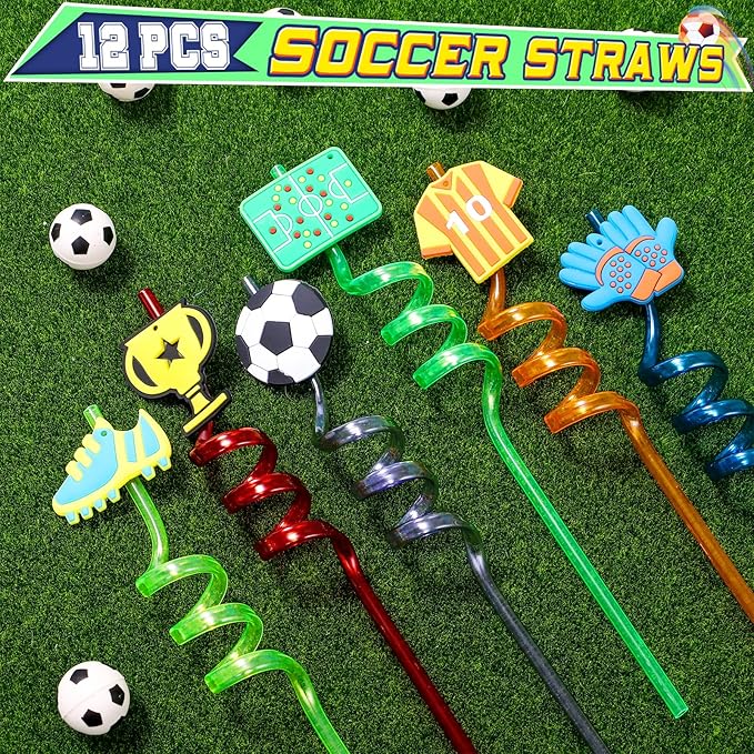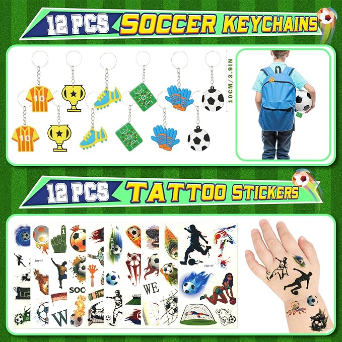 - 146Pcs Soccer Birthday Party Favors: We have carefully prepared a set of soccer theme party favors. The set includes 12 soccer straws, 12 bouncy balls, 12 whistles, 12 keychains, 12 silicone bracelets, 12 gift bags, 12 puzzle toys, 12 tattoo stickers, and 50 soccer stickers. The rich set can not only help you entertain 12 children, but also help you hold a grand soccer party