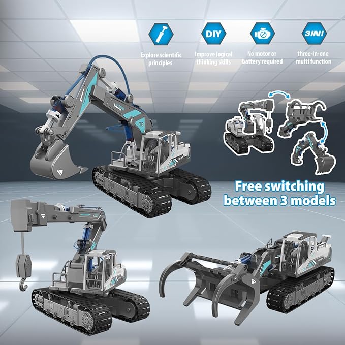 - STEM BUILDING BLOCK ASSEMBLY TOY SET FOR KIDS 8-12 YEARS - 3-IN-1 HYDRAULICALLY POWERED CONSTRUCTION TOY INCLUDING EXCAVATOR, CRANE AND TIMBER LOADER SCIENCE EXPERIMENT SMALL TOYS WITH POWERFUL LEARNING EXPERIENCE.