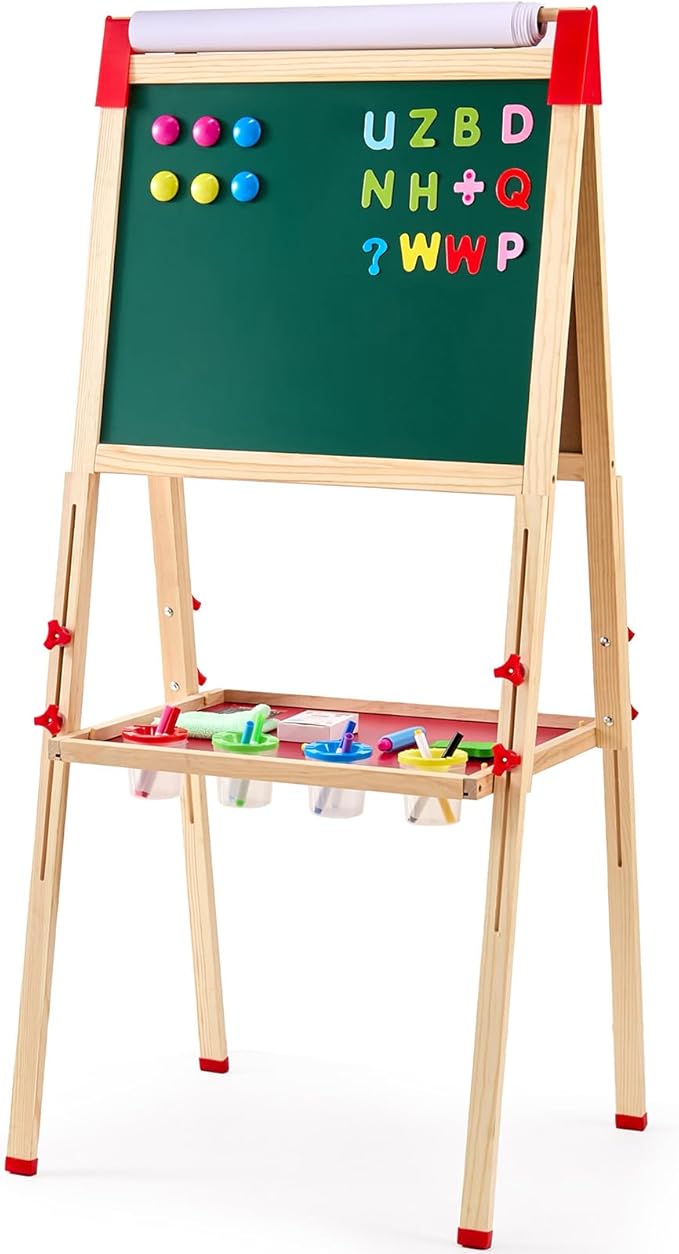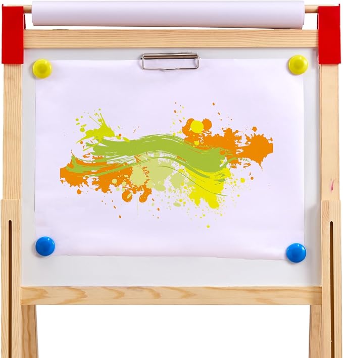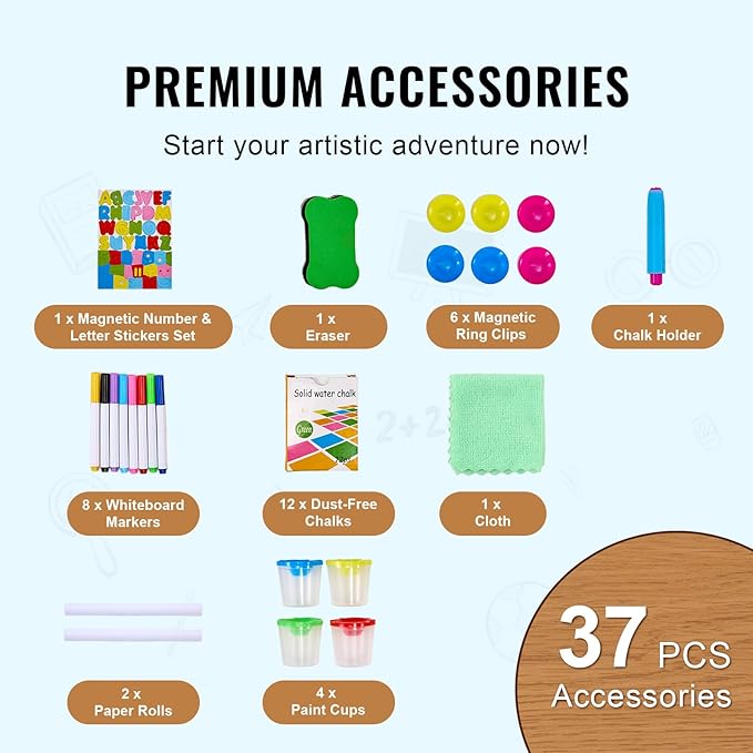 - All-In-One Set: We've packed this kids easel with everything they need! It comes with 1 x magnetic number and letter stickers set, 1 x eraser, 6 x magnetic ring clips, 1 x chalk holder, 8 x whiteboard markers, 12 x chalks, 2 x paper rolls, 1 x cloth, and 4 x paint cups—everything ready for them to dive into their next masterpiece.