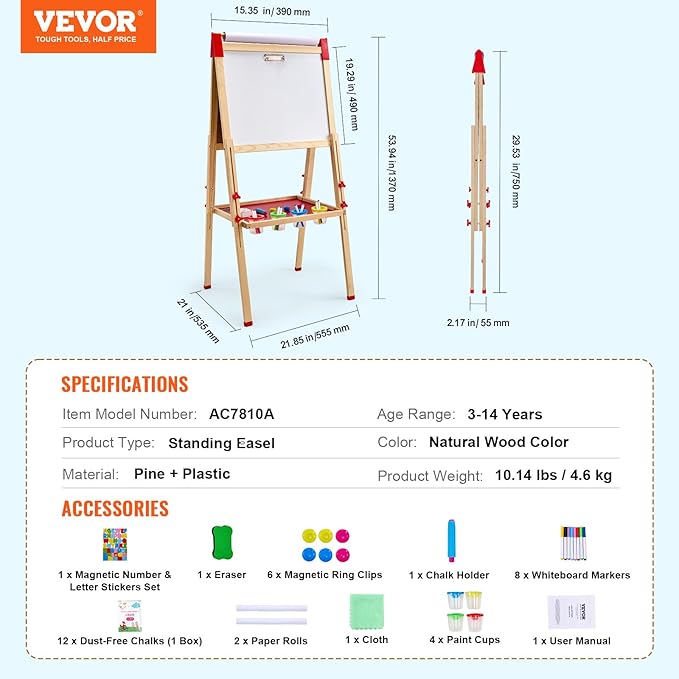 - Adjustable Height: With an adjustable height range of 44-54 inches (1110-1370 mm), this kids art easel grows with your child, making it perfect for ages 3 to 14. Just set it to the right height, and they're all set for a comfortable and enjoyable drawing experience.