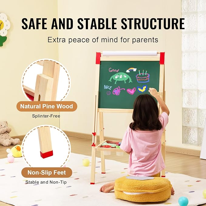 VEVOR Art Easel for Kids, 3-in-1 Wooden Double-Sided Kid's Art Easel with Magnetic Whiteboard, Chalkboard & Paper Roll, Adjustable Standing Drawing Board with Painting Accessories for Boys and Girls