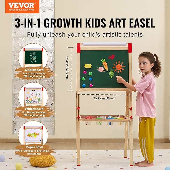 VEVOR Art Easel for Kids, 3-in-1 Wooden Double-Sided Kid's Art Easel with Magnetic Whiteboard, Chalkboard & Paper Roll, Adjustable Standing Drawing Board with Painting Accessories for Boys and Girls