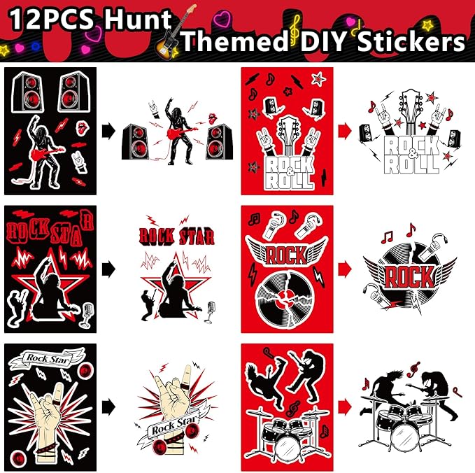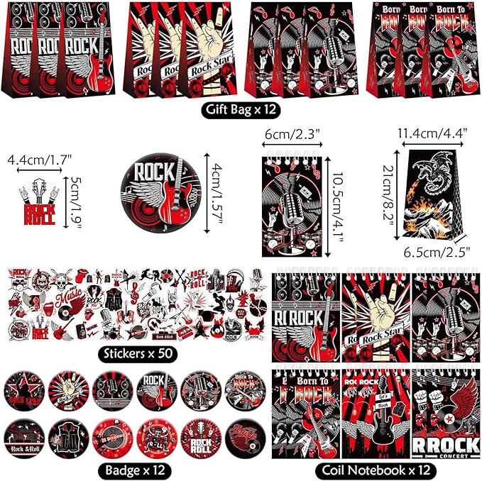 - Rock and Roll Party Supplies: Includes 12 wristbands, 50 luggage stickers , 12 gift bags, 12 slap bracelets, 12 DIY stickers (4 styles), and 12 rock theme button badges, which is enough for kids to share with others to have fun, and you can pack these in the party bags as giveaways for guests.