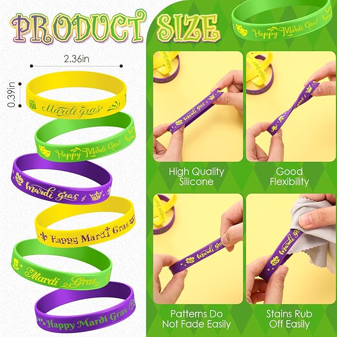 - Dependable to Serve You: the Mardi Gras themed party wristbands are made of tough and reliable silicone material, flexible but strong, serving you for a long time and giving you a nice using experience with confidence