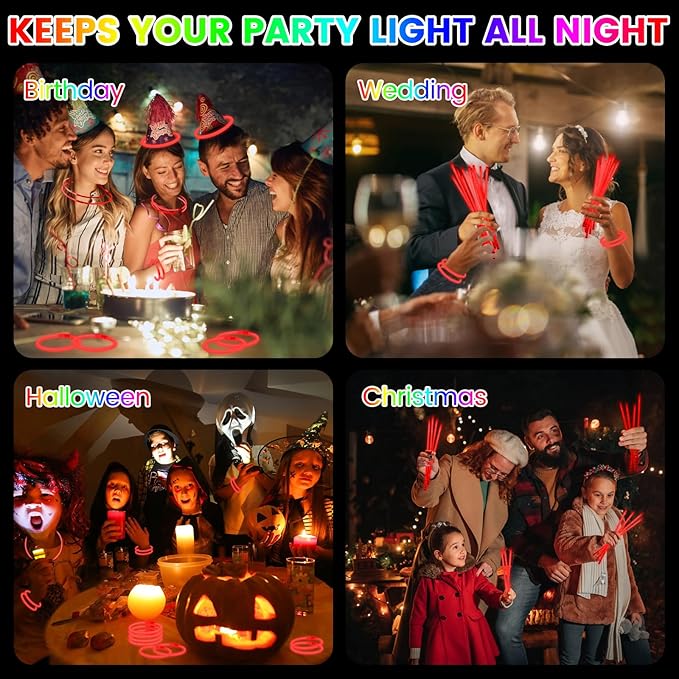 - Mulit-Use Party And Festival Decoration: Our glowsticks perfect for glow in the dark party supplies or holiday celebration event party decoration, glow party, birthday party, halloween trick or treat, christmas party, new year, valentine's day, easter, wedding, 4th of July patriotic, bachelorette party, carnivals, mardi gras, football party supplies, sports event, fireworks show, concerts, dance party, camping and so on. These festival bulk glow sticks set are perfect to keep any event lively!
