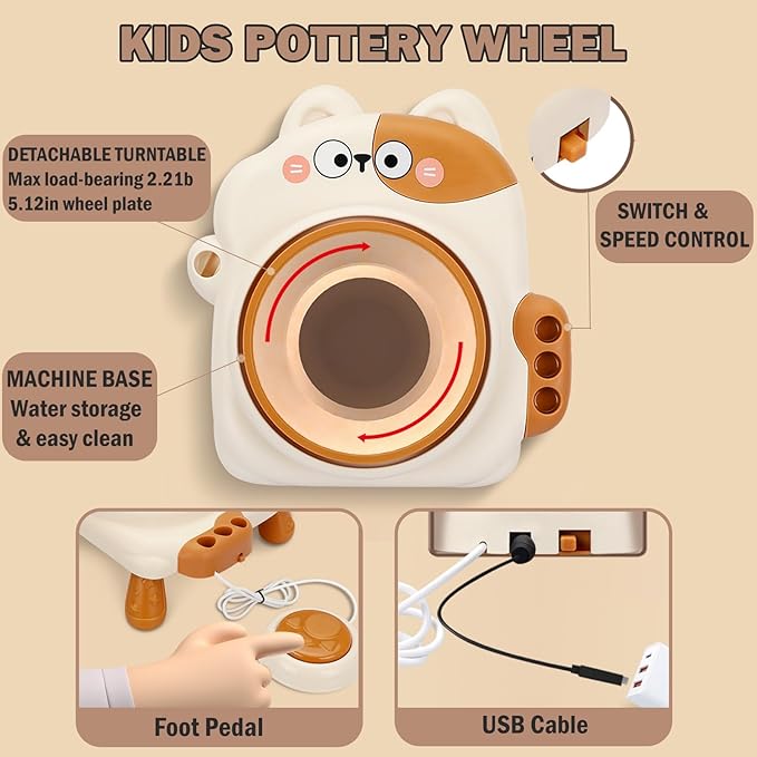- 【Easy to Use】The cute cat shape of the electric mini pottery wheel is deeply loved by children. The detachable turntable is convenient for cleaning after production. This beginner's pottery kit also has a built-in paint tray, so children can easily draw and decorate their works. Making pottery has never been so interesting