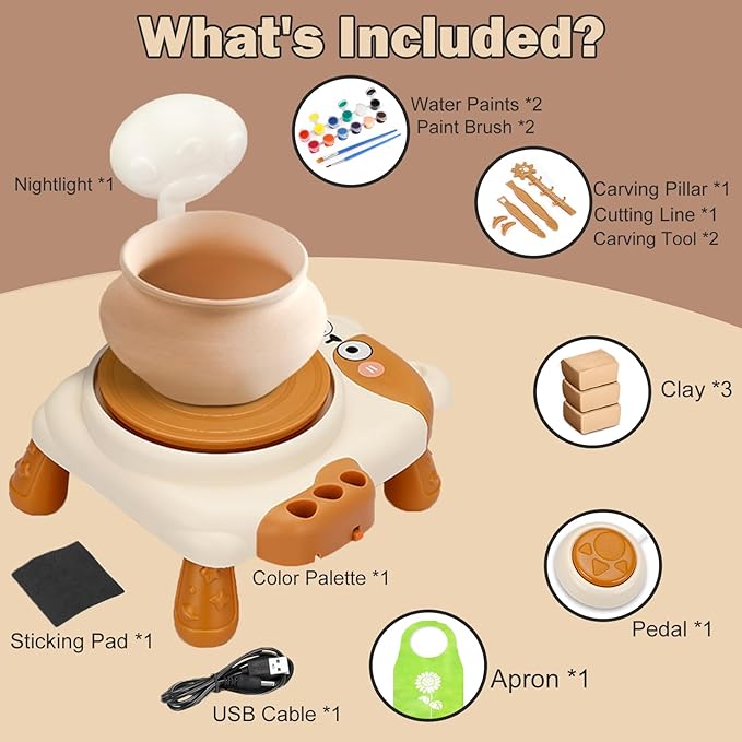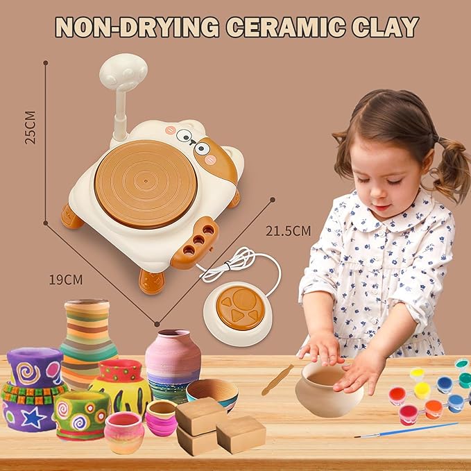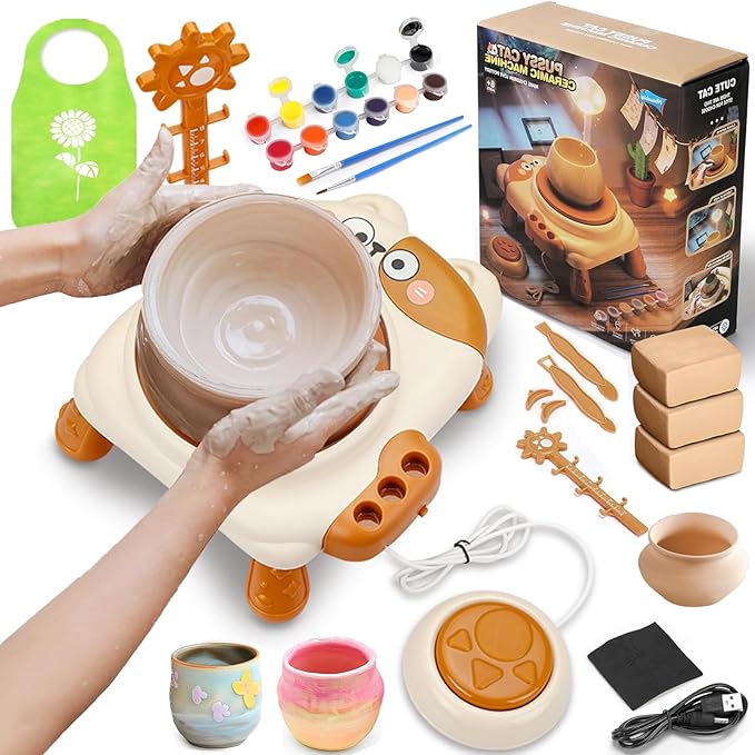- 【Making Your Own Pottery】Children's pottery wheel kit includes an electric mini pottery wheel designed by a lovely cat, carving tools, 3 packs of air-dried clay, 12 colors, 2 brushes, measuring ruler, palette and apron. Everything you need to mold your clay into amazing works of art is conveniently included in this toolkit