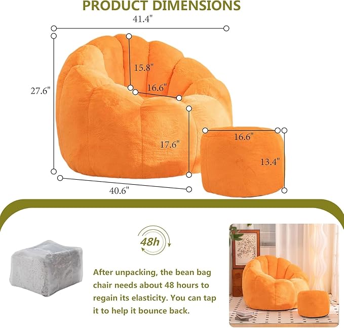 - 【Jumbo Bean Bag Chair】 The bean bag chair measures 41.4 “x40.6 ‘x27.6’ and is large enough for both adults and children. It takes about 48 hours out of the box for the bean bag chair to breathe and regain its elasticity, or you can tap it to encourage it to bounce back.
